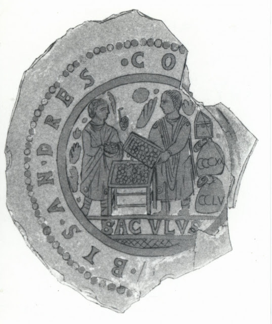 3 Gold glass, Czartoryski and Gołuchów, Poland Get link Facebook X Pinterest Email Other Apps Roundel with two men at a table and money: Roman money lenders. Gold glass with polychromy in red and blue. Numerous inscriptions: CCLV and CCCXX on the bags; SAC(c)VLVS under the scene; BIS AN DRES CO... around the scene. Diameter 7.8 and 9.3 cm.Source: http://lootedart.gov.pl/en/product-war-losses/object?obid=60480
